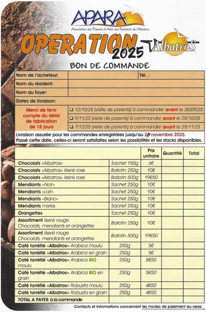 Comme chaque année, notre ami Philippe nous propose de satisfaire notre gourmandise légitime tout en soutenant l’association APARA (Albatros) qui le mérite.
