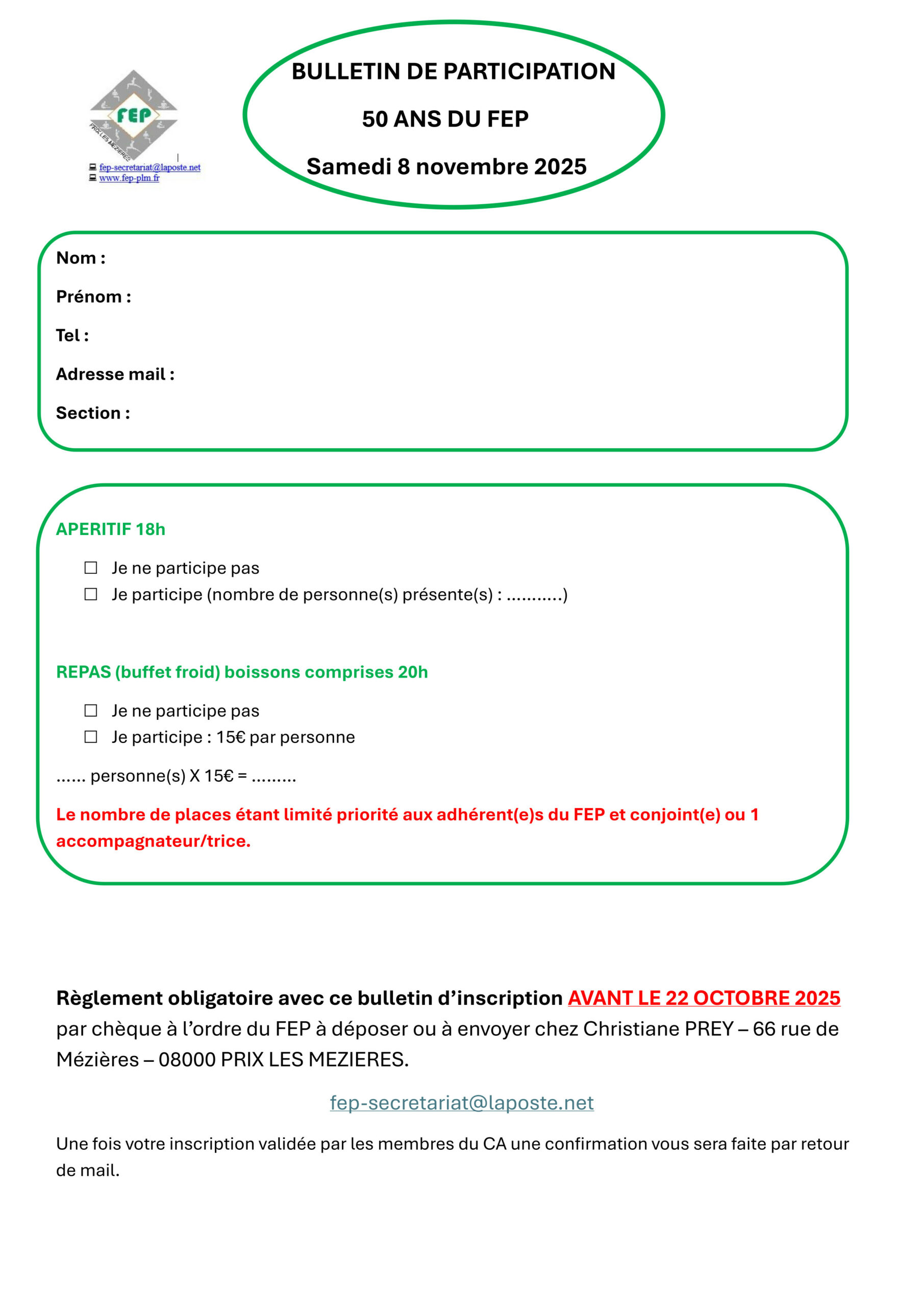 Le Foyer d’éducation populaire fête ses 50 ans le 8 novembre 2025 salle polyvalente de Prix les Mézières.